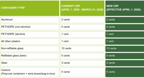 Transition of New Brunswick’s Beverage Containers Program to an extended producer responsibility (EPR) model – Deposit/refund and CRF rates in effect starting April 1, 2024.