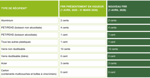 Programme de gestion des récipients à boisson à REP au Nouveau-Brunswick – Mise à jour quant aux FRR pour le 1er avril 2026