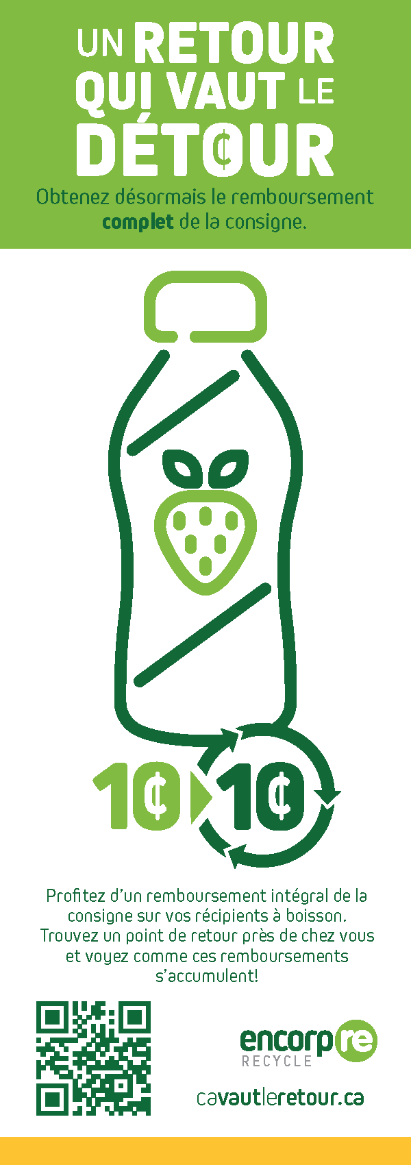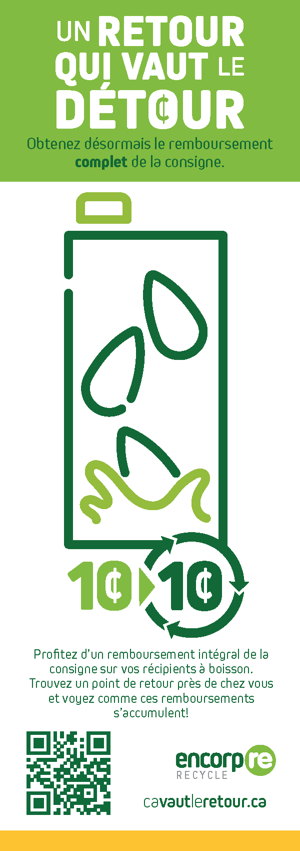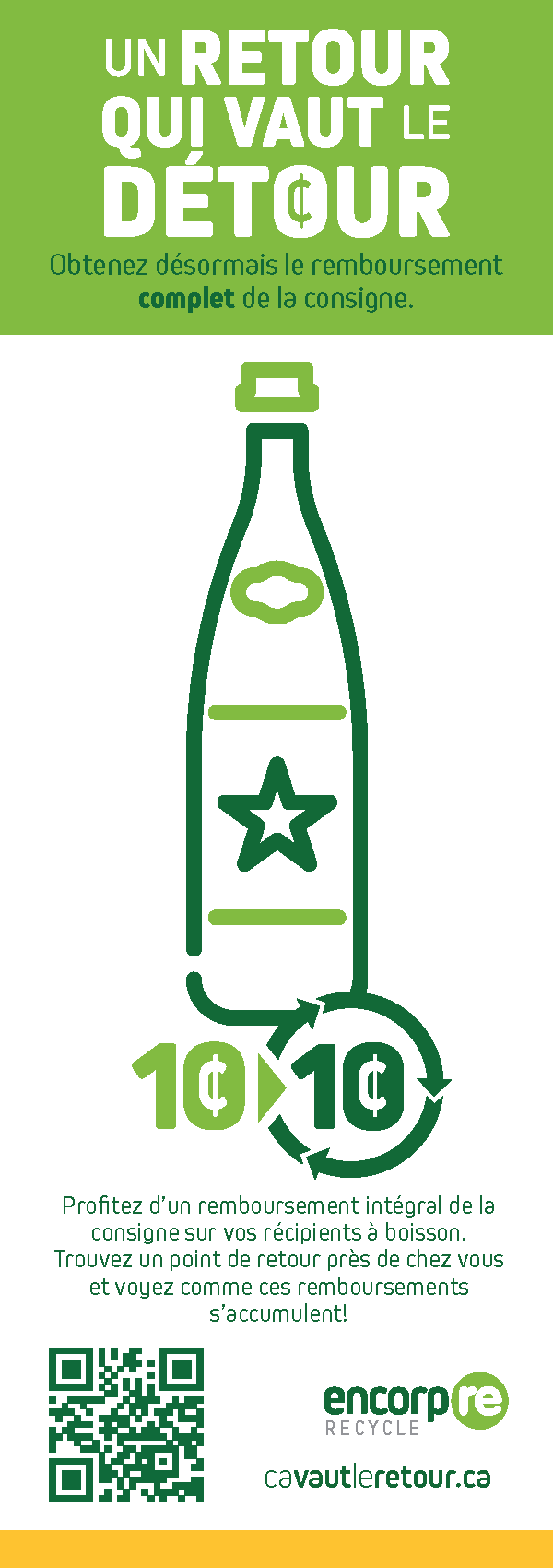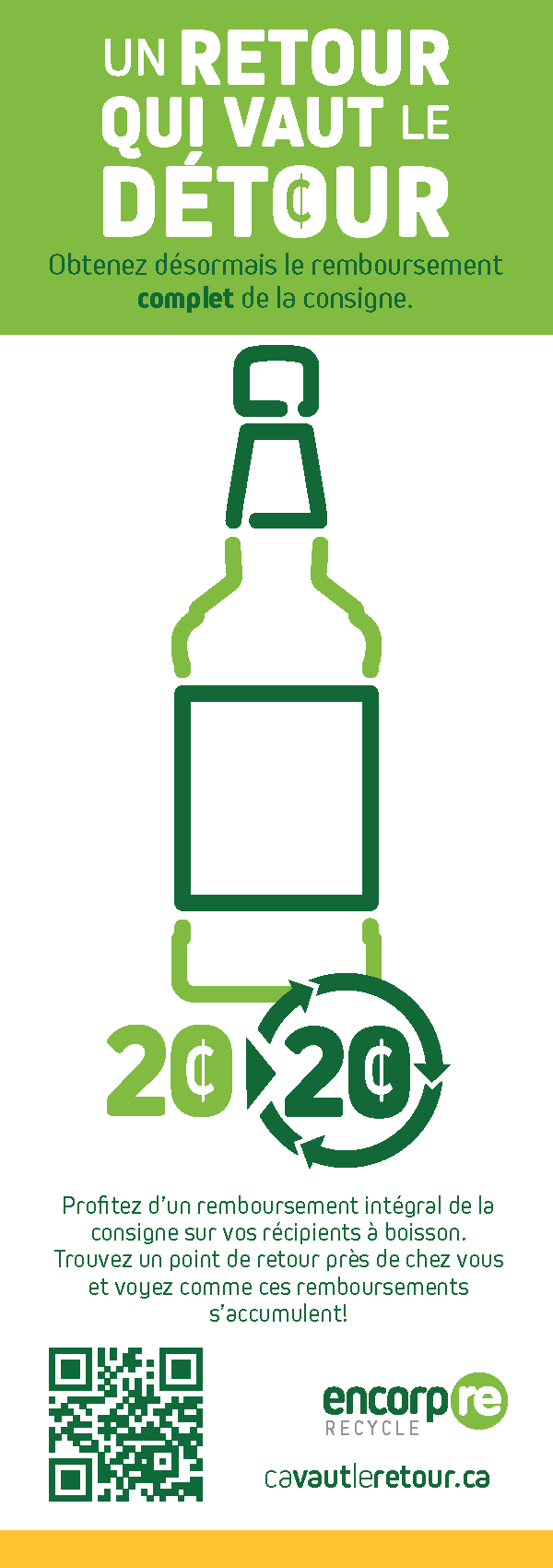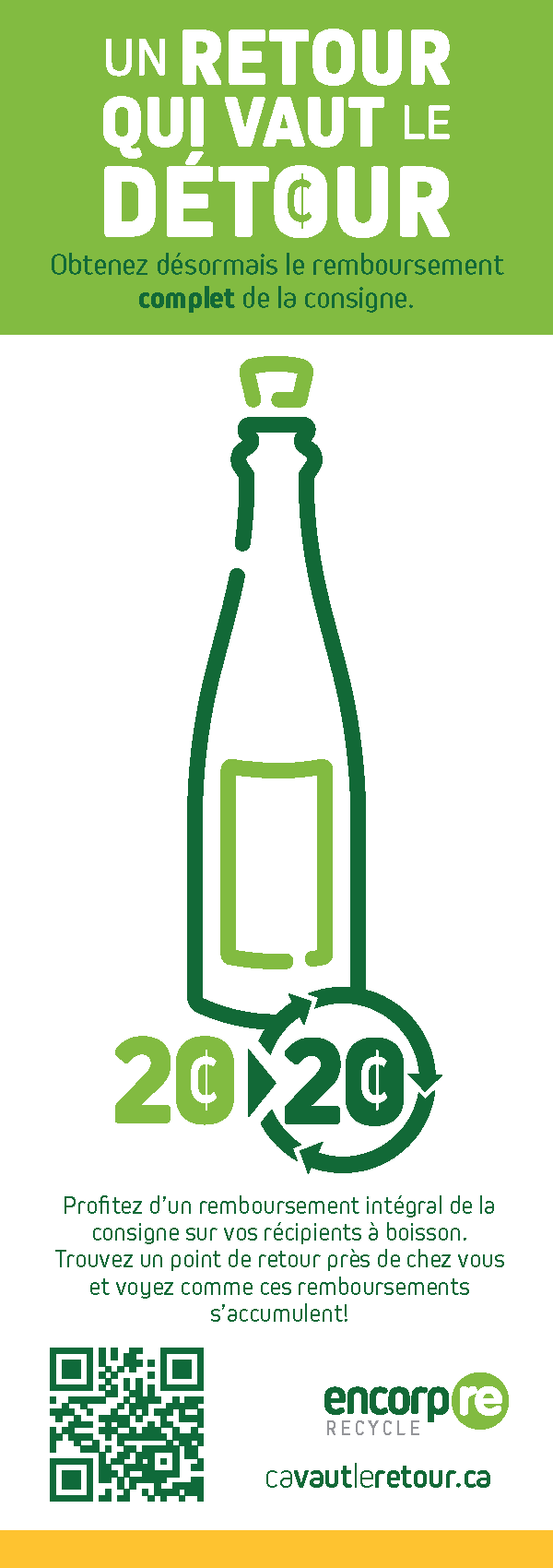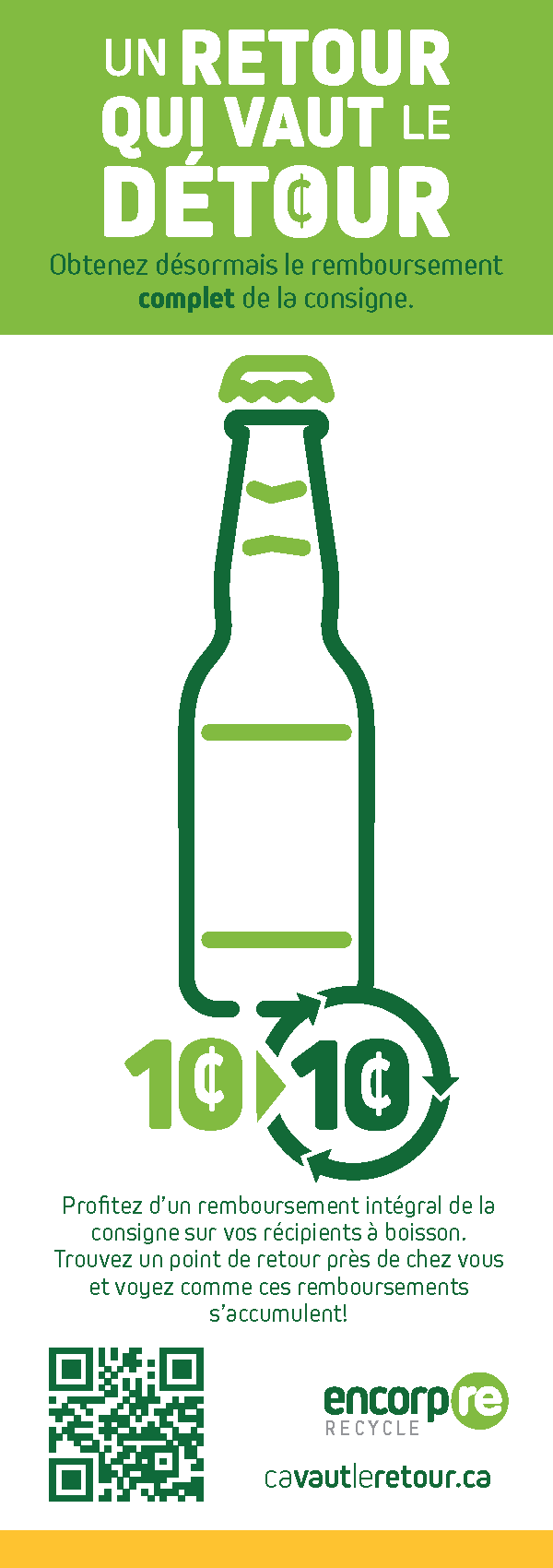 L’affiche « Un retour qui vaut le détour. Obtenez désormais le remboursement complet de la consigne. » conçue par Encorp peut être utilisée par les points de récupération des RBV et les détaillants, que ce soit sur leurs murs ou aux comptoirs de caisse.