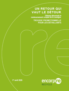 Encorp invite les détaillants à se joindre aux efforts promotionnels en utilisant le matériel de sensibilisation et d’éducation qu’il a développé dans leurs magasins sur les tablettes/étagères et présentoirs de produits de boisson et/ou comptoirs de caisse. Ce matériel incite les consommateurs à rapporter les récipients vides aux points de récupération désignés pour les RBV pour obtenir un remboursement intégral de la consigne et fournissent un lien vers le site Web d’éducation des consommateurs d’Encorp — cavautleretour.ca — pour de plus amples renseignements.