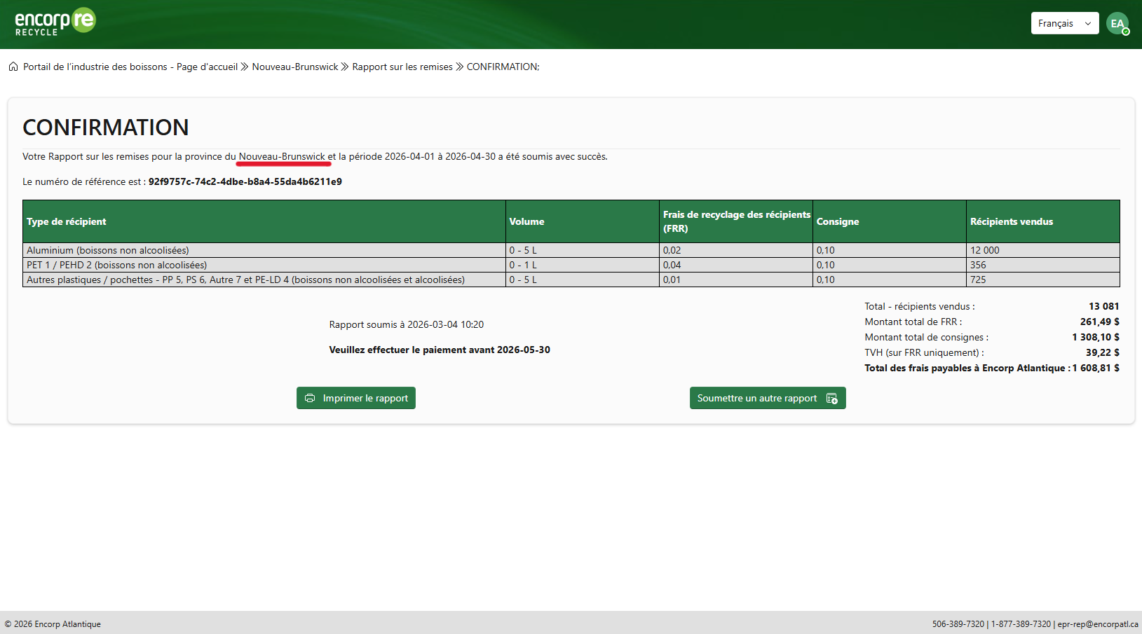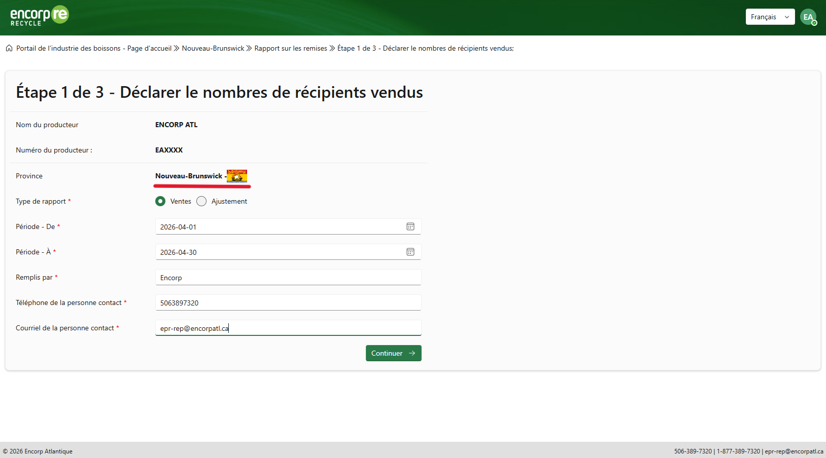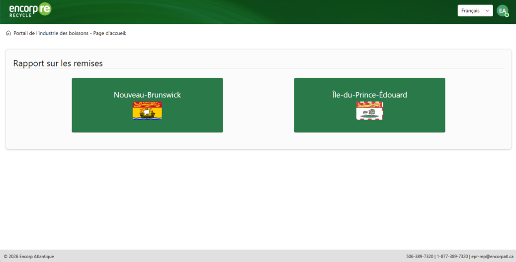 Encorp est heureuse d’annoncer que le Portail de l’industrie des boissons a été mis à jour afin de permettre la production de rapports pour le Nouveau-Brunswick et l’Île-du-Prince-Édouard (Î.-P.-É.). Lorsqu’ils remplissent un rapport, tous les utilisateurs devront choisir la province pour laquelle ils effectuent un versement. Notez cependant qu’il vous sera impossible de soumettre un rapport pour l’Î.-P.-É. avant avril 2026.