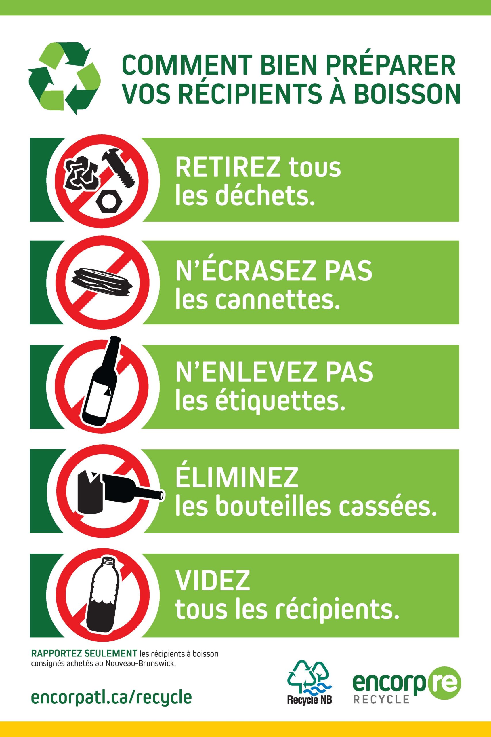 Pendant plus de 30 ans, les consommateurs du Nouveau-Brunswickétaient habitués à payer une consigne lorsqu’ils achetaient des boissonsprêtes à boire scellées et à se faire rembourser la moitié de cette consigne lorsqu’ils rapportaient leurs récipients vides à un CR aux fins de recyclage.