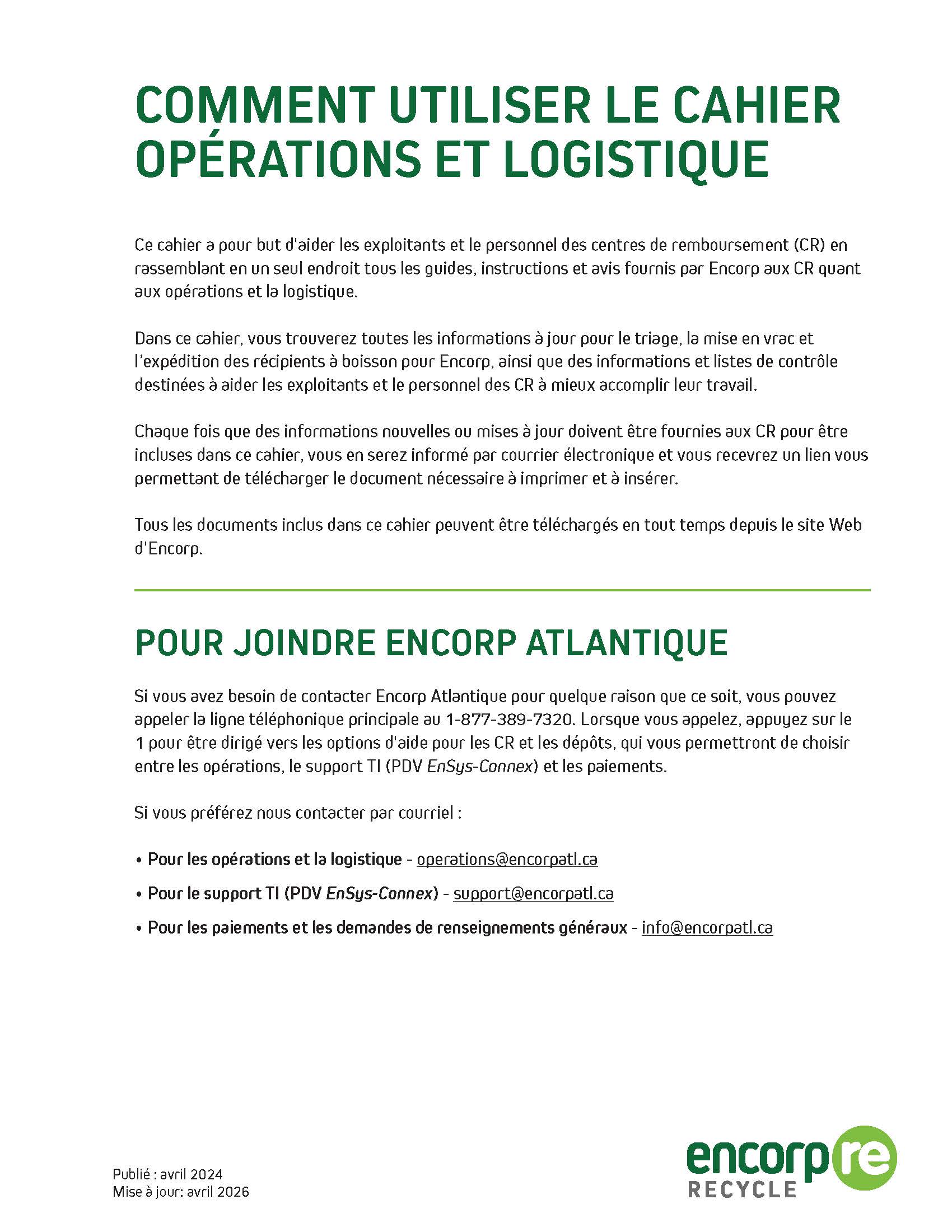 Le cahier des Opérations et logistique a pour but d’aider les exploitants et le personnel des centres de remboursement (CR) en rassemblant en un seul endroit tous les guides, instructions et avis fournis par Encorp aux CR quant aux opérations et la logistique.