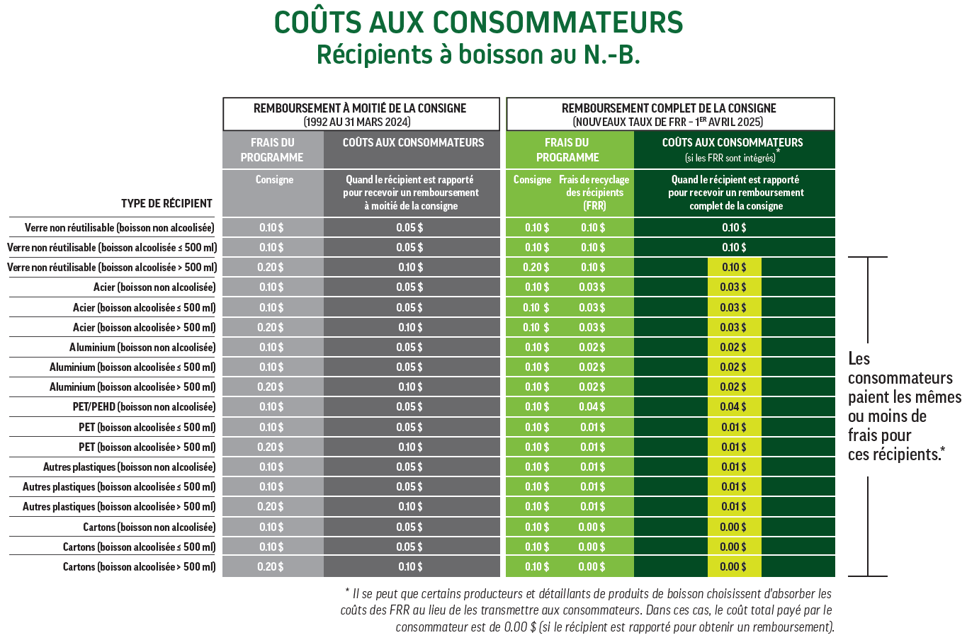 Les FRR sont des frais de traitement et de gestion environnementaux qu’Encorp facture aux producteurs de boissons afin de couvrir les coûts nets liés à la collecte, au traitement et à l’acheminement de leurs récipients à boisson vers des installations de recyclage. Certains peuvent choisir d’absorber ces coûts, tandis que d’autres peuvent choisir de les répercuter sur les détaillants, qui, à leur tour, peuvent les absorber ou les répercuter sur les consommateurs, comme ils le font pour de nombreux facteurs contribuant aux fluctuations des prix des produits d’épicerie et des marchandises. Selon le Règlement en vigueur au Nouveau-Brunswick, les FRR doivent être intégrés au prix total du produit à boisson lorsqu’ils sont transmis aux consommateurs.